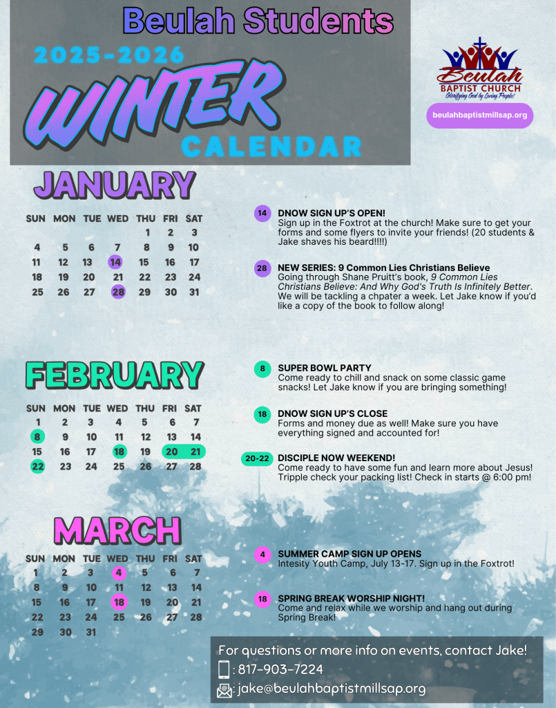 February 20-22 – Disciple Now Weekend! Sign up your student in the Foxtrot, talk to Jake for forms and more details! Volunteer sign-ups in the Foxtrot!